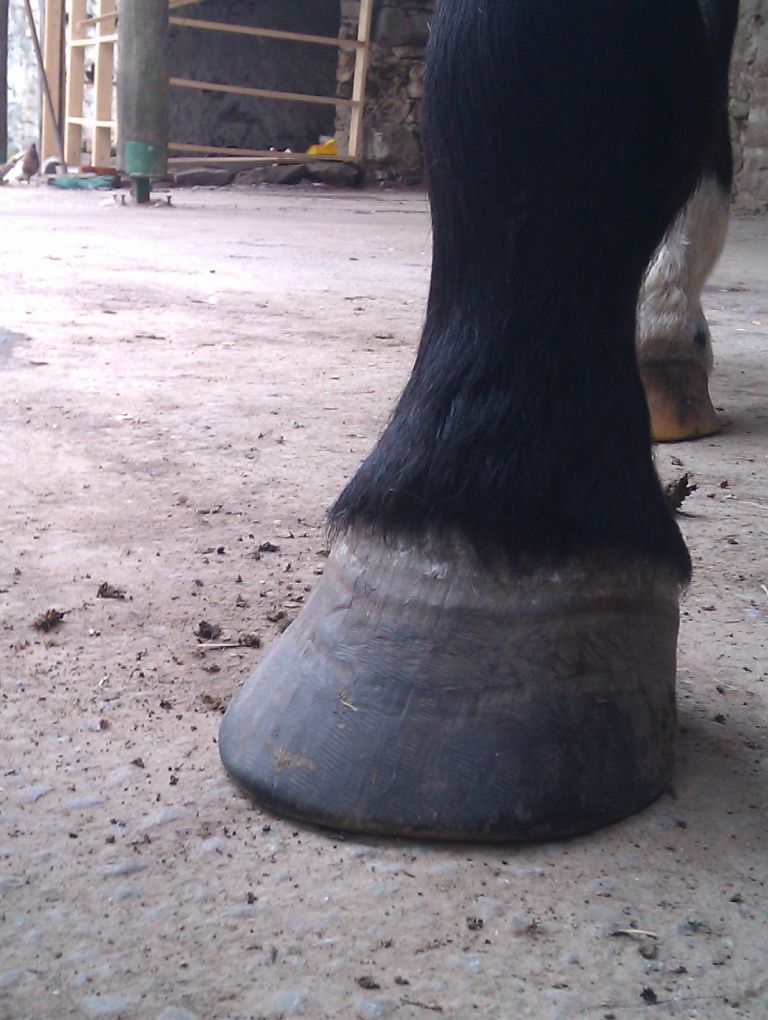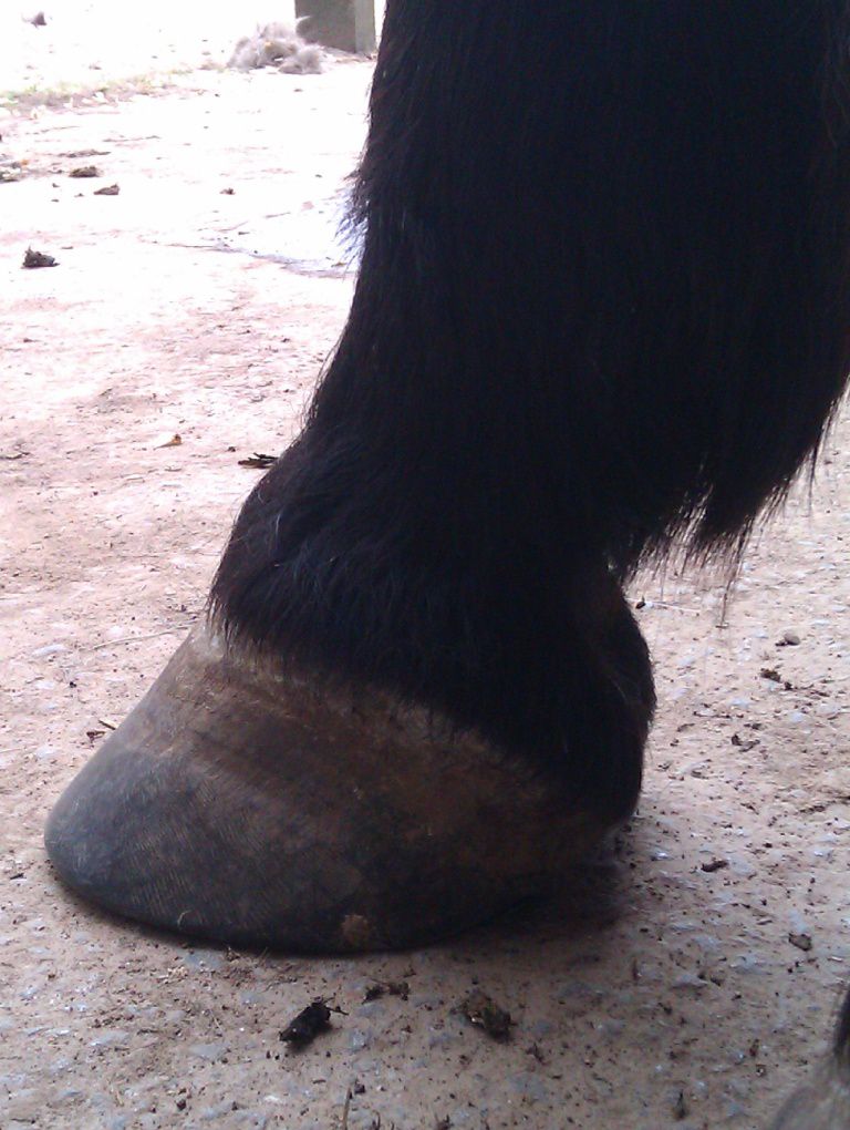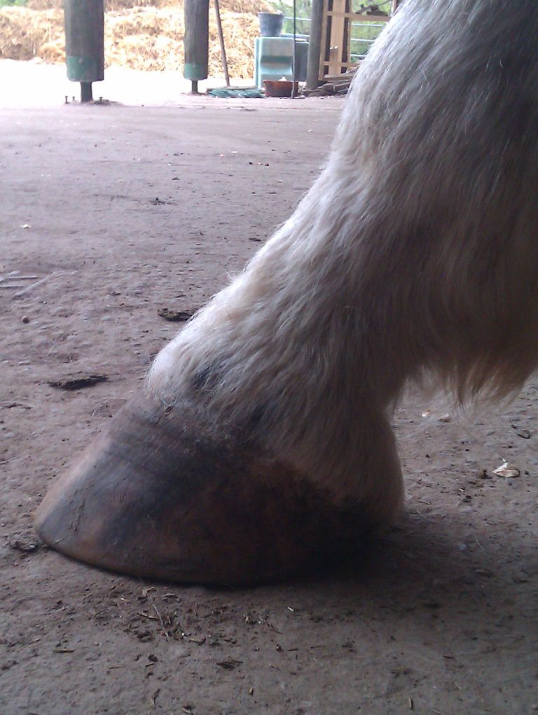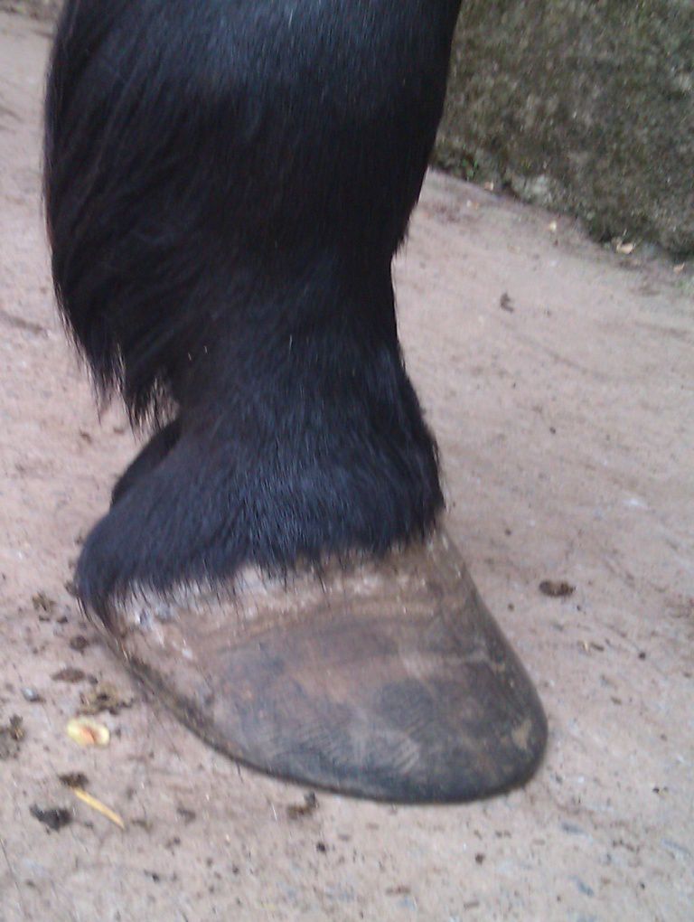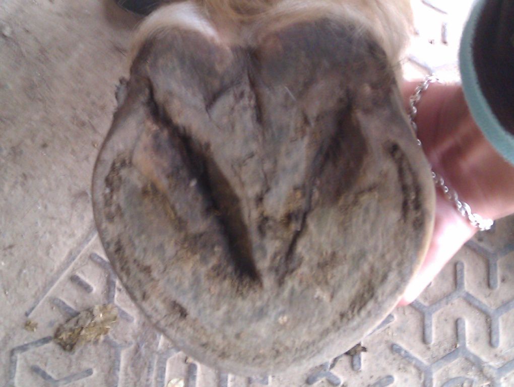 | Dire merci | Il te faudrait plutot un bon foin ou une bonne pature et juste 2L de granulés pour le symbole. Un cheval Tf de 1,70m chez moi c'est 15 kilos de foin de crau/jour..... Peut être la photo est elle trompeuse, mais les cotes sont trop visibles et le cul creux; pas normal pour un TF modèle "anglo normand". Sinon NON NON NON une seime ne vient pas "comme ça". Elle provient d'un défaut de parage, qui cause un évasement (peu visible si on est pas habitué) et crac, la seime s'ouvre et là un énorme évasement apparait progressivement. sur tes photo des autres pieds on voit aussi de l'évasement, ce pédicure ne traite pas bien ce problème. Il faut que tu insistes. Les évasements c'est fatiguant à traiter pour le pareur; mais c'est indispensable. Et même en une fois, aucun risque de faire boiter ton cheval ! au contraire, car l'évasement tire la corne vers le dehors et ça fait mal. |