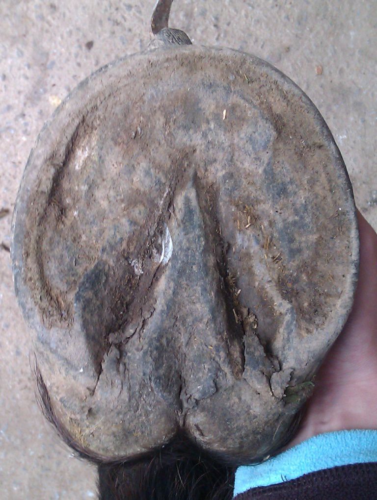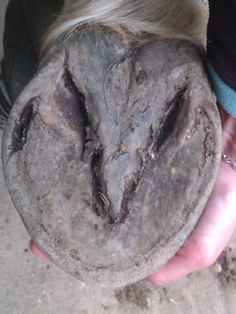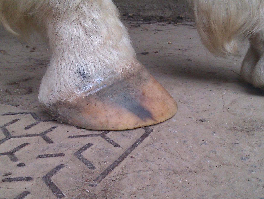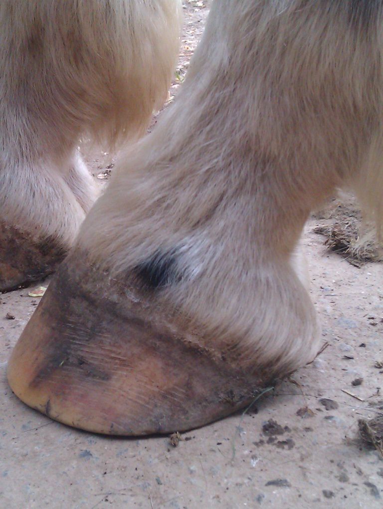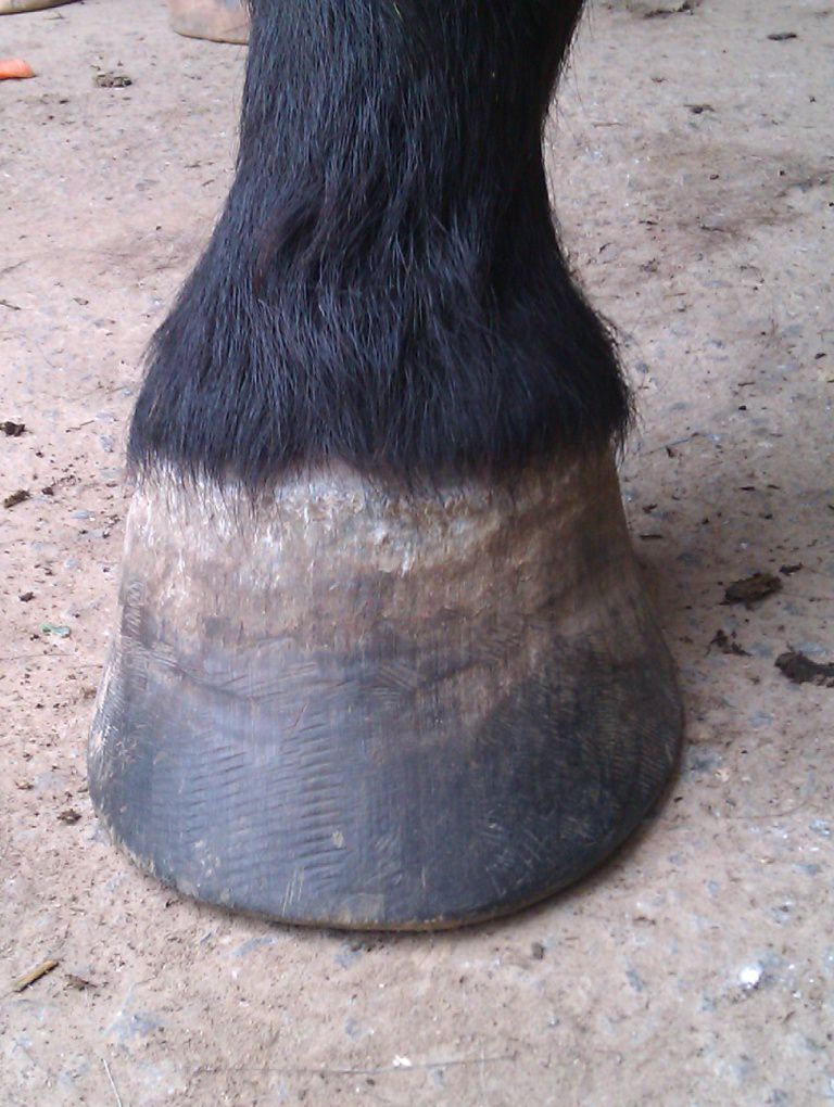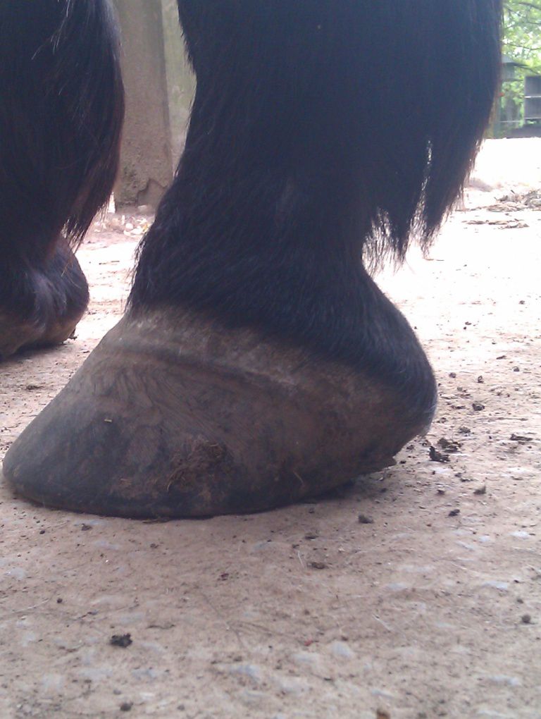 | Dire merci | Il te faudrait plutot un bon foin ou une bonne pature et juste 2L de granulés pour le symbole. Un cheval Tf de 1,70m chez moi c'est 15 kilos de foin de crau/jour..... Peut être la photo est elle trompeuse, mais les cotes sont trop visibles et le cul creux; pas normal pour un TF modèle "anglo normand". Sinon NON NON NON une seime ne vient pas "comme ça". Elle provient d'un défaut de parage, qui cause un évasement (peu visible si on est pas habitué) et crac, la seime s'ouvre et là un énorme évasement apparait progressivement. sur tes photo des autres pieds on voit aussi de l'évasement, ce pédicure ne traite pas bien ce problème. Il faut que tu insistes. Les évasements c'est fatiguant à traiter pour le pareur; mais c'est indispensable. Et même en une fois, aucun risque de faire boiter ton cheval ! au contraire, car l'évasement tire la corne vers le dehors et ça fait mal. |
