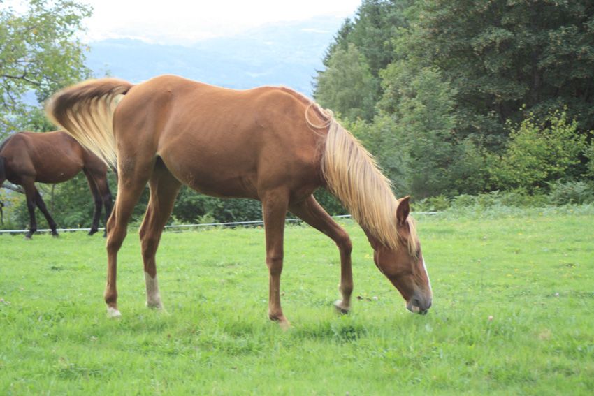 | Dire merci | pour moi cet étalon a plus les crins gris que délavés.....je ne sais pas quel gêne intervient pour les crins gris mais on en voit pas mal chez les traits bretons... Si le silver était si courant alors ca ferait longtemps que j'en aurais vu par chez moi....il y a des arabes à tous les coins de champ et pas un seul qui paraisse porter ce gêne....et je met bien de côté les gris.....pourtant, il y a bien des étalons bai ou bai brun...ou alezan...comme celui-là par exemple, qui a la crinière délavé et pas la queue, j'ai vu plusieurs de ses poulains et aucun n'a la moindre trace de silver...bizarre, hein ? |