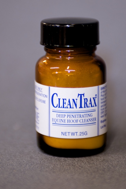 | Dire merci | A Real Solution CleanTrax is a deep penetrating hoof cleanser proven effective in eliminating even the toughest infections, in most case with just a single application. How to Use CleanTrax * Remove the shoes and, if appropriate, prepare the hoof for shoeing; rinse away excess dirt and debris. * Pour the entire contents of one bottle (25 g) of CleanTrax into one gallon of cool or lukewarm water. * Put all of the solution in a CleanTrax Hoof Boot, a reinforced plastic bag, or a tall medicating boot. * Insert the hoof into the CleanTrax solution and soak for 30 minutes; if the infection is severe or recurring, increase soak time to 45-60 minutes. NOTE: CleanTrax solution is effective for a total of 90 minutes, so 1-3 hooves can be soaked consecutively by moving the solution to another hoof. * After soaking, DO NOT RINSE OR DRY THE HOOF; cover the hoof with an empty plastic bag, seal the top, and allow vapors to penetrate for 30-60 minutes. * After use, the solution can be spread on the stall floor to eliminate bacteria, fungi, and spores which could reinfect the hoof. * Monitor hoof development for one shoeing interval (4-8 weeks) and, if necessary, repeat the treatment. * CleanTrax can be used as a preventative by soaking each hoof for 20 minutes (1 bottle per horse) every 3-4 months. Special Considerations * CleanTrax is available in single-use 25 g bottles. * Do not open the bottle until you are ready to use it. * Store the bottle in a refrigerator or a cool, dry place. Do not leave it in the sun or expose to heat. * CleanTrax is completely safe when used as directed. * The CleanTrax Hoof Boot is made of heavy duty vinyl and is reusable. * The powder and solution are for external use only. Keep away from small children and pets. The solution will damage colored fabrics. ![]() |
