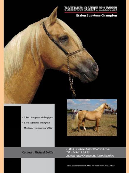 | Dire merci | en beauté dans les polominos : il est 6 fois champion de belgique 5 fois champion suprémes et meilleure reprducteur 2007 ![]() le voila et la maman de mon rock saint martin sappel sam sara saint martin et elle doit étre palomino normalement |