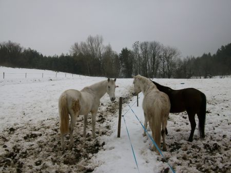 Oui tu sais, Rondador aussi manque de muscles ! ![]() Et puis avec la neige qui est arrivée y a 15 jours, j'ai dû arrêter d'un coup le travail que je lui faisait ! Mais demain, c'est balade et je vais reprendre le travail en longe, avec des élastiques pour recommencer le muscle du dos ! Et oui le petit repos de Rond touche à sa fin !! ![]() |