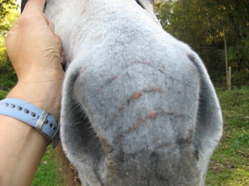 Dire merci | Tient mon poney avait ça aussi, mais c'était moins étendu. Par contre ça ne le grattait pas. On a changé les chevaux de place dans le champs, et depuis, plus rien ... |