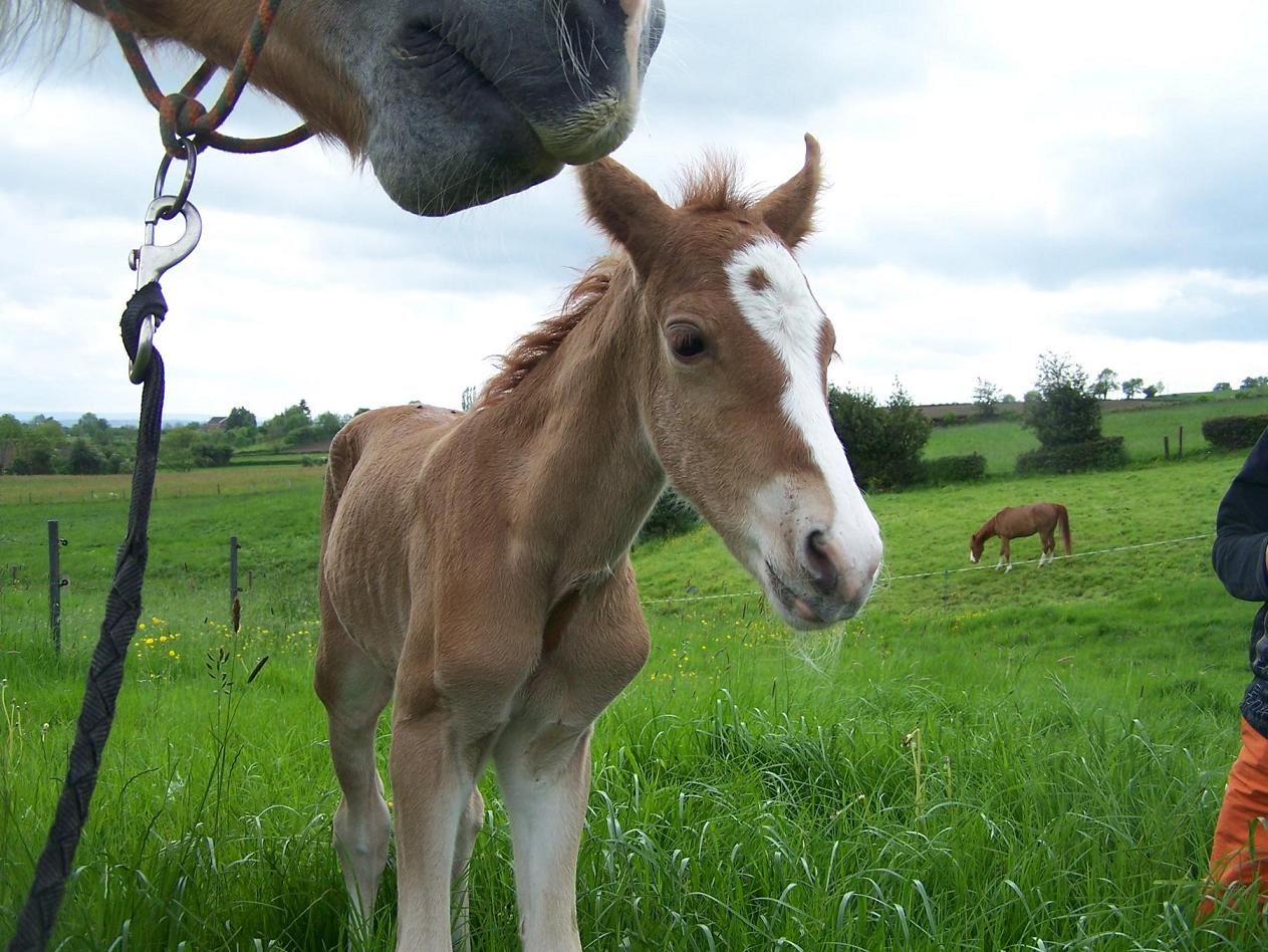 | Dire merci | En mai dernier, je m'occupais d'une jument comtoise pleine appartenant à un maquignon donc autant dire, pas de surveillance, pas d'abri, pas de paille par terre, rien Elle était au pré avec une autre comtoise qui devait être pleine elle aussi mais qui a pas pris ... Il n'y a que moi et une amie qui faisions un relais pour arriver à passer matin et soir pour s'assurer que tout allait bien ... Elle a mis bas par une belle journée en fin de matinée et visiblement dans le fond du pré sous un gros arbre ... Par chance tout c'est bien passé Quand je suis passée les voir entre midi et deux, tout le petit monde était serein et l'autre jument ne cherchait absolument pas à aller voir le petit et sa mère sachant tout de même que ce sont des juments qui ne font que pouliner ... |