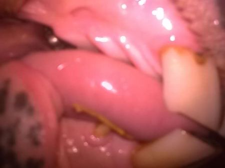 | Dire merci | ![]() Voilà donc elle en a 2 petites comme ça en bas, avant elle avait les même en haut (vous pouvez d'ailleurs voir le petit trou que ça a laissé) Bon la qualité de l'image est bof , puis tenir la bouche ouverte d'une main et prendre la photo avec l'aitre c'est dur En fait je sais pas c'est comme si c'était des bébé crochet, vers 5 ans et demi ils sont sorti, sont resté de la même taille depuis (elle a 11 ans), au début je me disait qu'en haut ils étaient peut être tombés parce que madame avait inventé "les crochet de lait" .Bref pour son dentiste c'est des crochet très peu développé |
