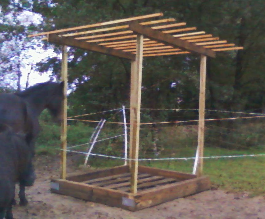 | Dire merci | fanny merci bon alors je réfléchie a faire un râtelier avec un fond en filet qui se rabattrait au dessus niveau mesure sa serait un carré de 2m/2m pour le toit on verra ensuite mais je mettrais les 4 piquet comme vous pour préparer la chose pour l'hiver prochain j'irais au magasin la semaine prochaine et je commencerais la fabrication chez moi petit a petit parce que pour le moment avec la neige on peut pas se rendre jusqu'au pré avec la voiture |