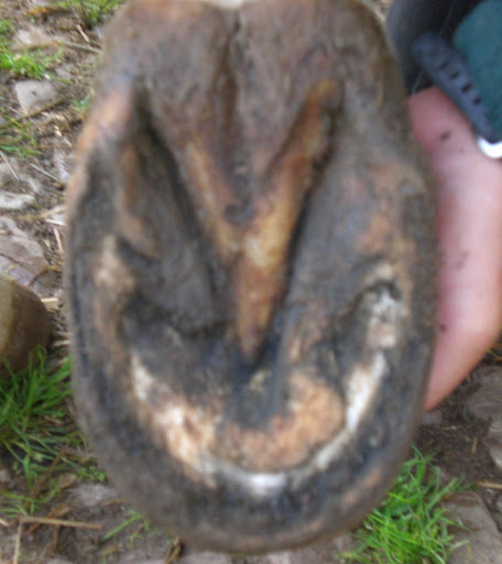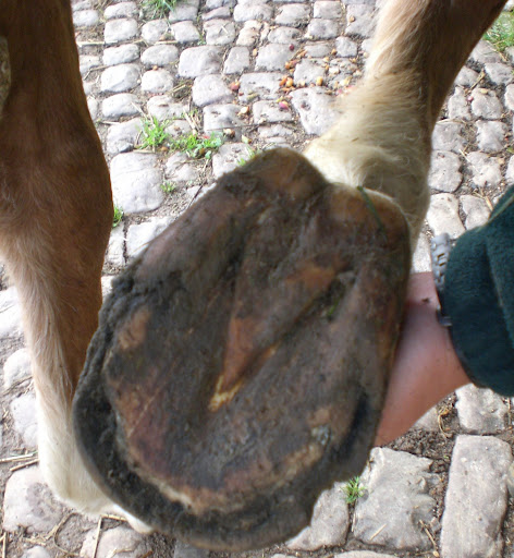 DéconnectéDire merci | El Bimbo, c'est surtout un pied excessivement négligé. Il y avait double sole et double fourchette, la fourchette du dessous étant en plus très profondément infectée dans la lacune centrale. J'ai déjà vu un pied tout semblable : le pied-bot de mon cheval le jour où il a été déferré et paré. |