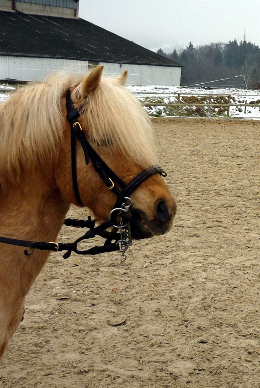 | Dire merci | Je comprends ce que tu veux dire Luky ... quelque part tu as peut-être raison ... Je pense que le pelham que je lui mets est plus confortable d'utilisation pour elle (droit, en caoutchouc, les renes de la gourmette ne sont quasiment jamais utilisées), que le filet simple en métal contre lequel elle se bat. Avec le filet, elle passe son temps à m'arracher les renes, ce qu'elle ne fait pas avec le pelham. Le fait de changer de mors ne rend pas le cheval plus calme, mais plus controlable quand il "monte dans les tours" lors d'exercices plus difficiles (pour elle par exemple le contre-galop où elle a tendance à me prendre la main). |