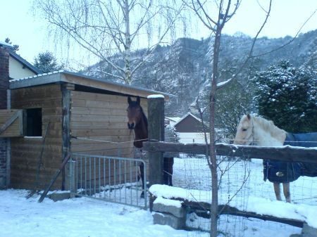 | Dire merci | j'ai ce système pour l'hiver le paddock, j'ai acheté des billes de chemin de fer de réemploi prises dans le béton à 60 cm dans le sol, puis des plaches canadiennes doublé de fil électrique, t'a beau faire, vaut mieux électrifier : un jour il va se gratter les fesses dessus et coucher ta clôture! ou la grignote! Je mets du foin plusieurs fois par jour DANS les boxes pour éviter le gaspi, et celle qui tavaille est complémenée 2 fois par jour 2x2Lfloconné + é fois 1 L luzerne ![]() " alt="" /> [url=https://www.1cheval.com/membre/services/photos/images/19088.jpg] ![]() [/url]" alt="" /> ![]() " alt="" /> ![]() " alt="" /> voilà diverses photos été/hiver neige, en ce moment c'est BOUE sauf juste devant les boxes où c'est stabilisé au tout venant |