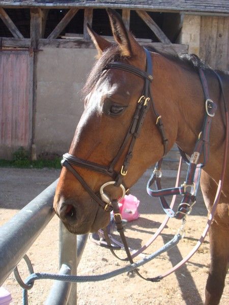 | Dire merci | sinon j'ai mouuultes filet, un de pokuir que j'essaye de revendre car ne convient pas a mes juments, un eric thomas de chez decathlon payé 36€ je l'ai depuis 3ans tres contente , un noir eric thomas que j'adore![]() en noir il est plus joli j'ai aussi un freedom bitless, noir simple, un vieux filet, un bridon portugais je pense de marque excelsior... |