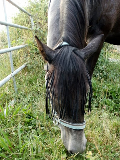 | Dire merci | J'ai eu peur l'année passée, Scarlett s'était tout arraché la crinière (sauf le tiers du haut), raccourci la queue (pas compris comment !) et gratté la base, signes caractéristiques... Je m'attendais donc cette année à une vraie attaque... Je croise les doigts mais ça a l'air de bien se passer finalement... Je les pulvérise avec de l'émouchine, elles n'aiment pas trop mais c'est assez efficace (je la dilue sans doute trop mais je préfère ainsi) Seul problème, ça tache la robe plutôt claire de Scarlett. Autour des yeux, je passe avec une compresse. |
