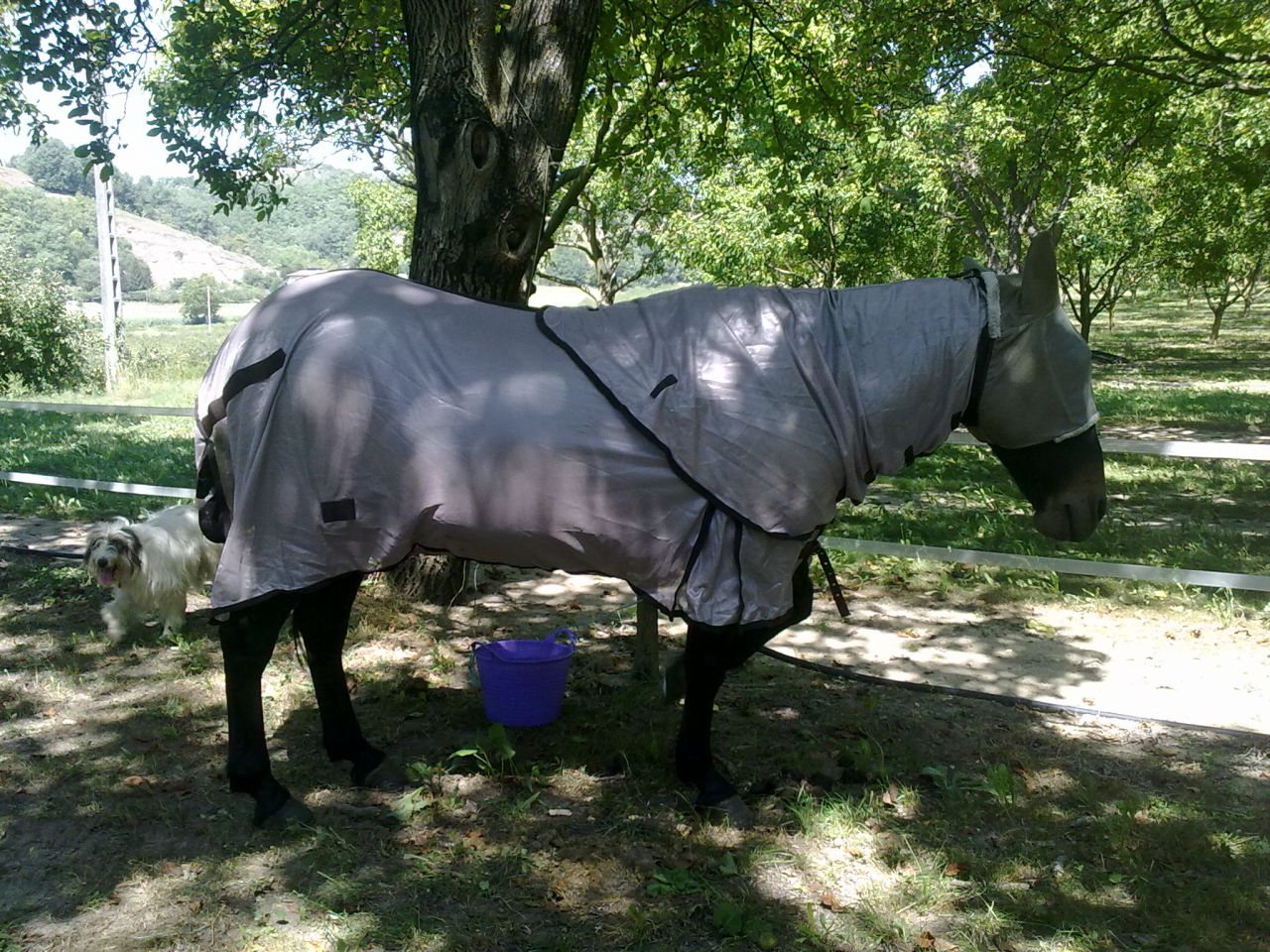| Dire merci | Ma petite puce passe son temps à se rouler pour tenter d'écraser les méchantes bestioles qui l'agressent, au point de se râper le dos, voire même de s'égratigner. Bon, avec la pluie quasi permanente, pas de bestioles et ça donne le temps de cicatriser, faut voir le bon côté de ce temps pourri ![]() J'ai donc trouvé sur la sellerie-on-line une couverture à sa taille. Le look n'est pas super, la couleur a l'avantage de passer assez inaperçue, mais la conception en est assez bien. Ca serre bien (trop !) juste derrière les oreilles, pas de possibilité qu'une bestiole s'introduise par là. Les courroies de cuisses sont plus ajustées que celles des couvertures d'hiver. La partie sous-ventrale assure un bon contact, limite serrée là aussi bien que réglée au max. Il y a en plus une partie qui passe entre les antérieurs et vient se fixer sur cette "sous-ventrale" pour protéger la très sensible zone inter-ars. Ils fournissent en cadeau un masque anti-mouches "adapté à la taille de la couverture" mais qui nous parait beaucoup trop grand. Avantage, les oreilles rentrent parfaitement ! Mais ça flotte et les bestioles peuvent passer sous le masque, je suppose que c'est pire que rein, quelle expérience avez-vous de cet objet ? |