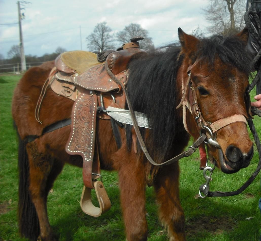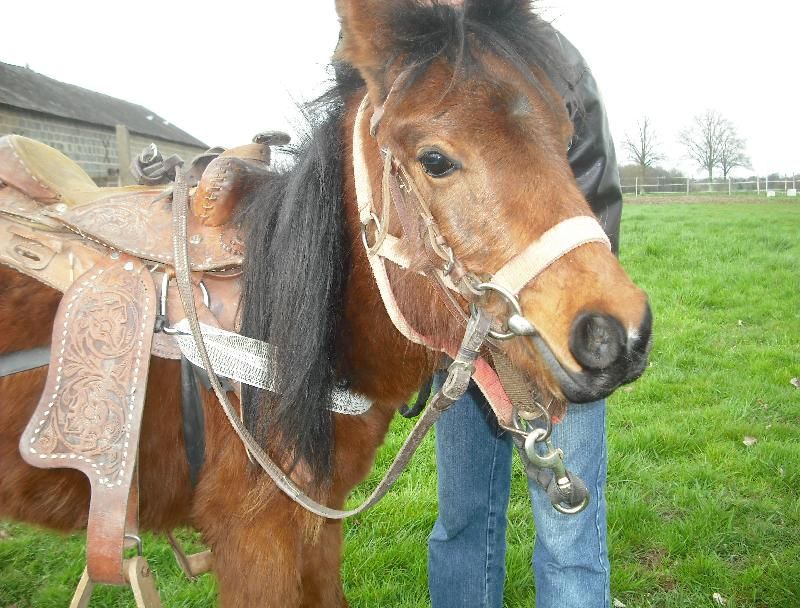 | Dire merci | Un poney qui vit "en famille" pas spécialement peureux, même à deux ans, ne dira rien pour la selle ... En tout cas, les deux miennes n'ont jamais rien dit ... Par contre, il est sellé bizarement non ? ![]() |