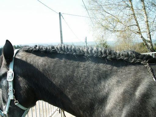 | Dire merci | J'ai vu préparer les percherons par ici, ils sont carrément à cheval pour faire la tresse, ça semble effectivement plus pratique pour avoir quelque chose de bien régulier sur le dessus de l'encolure... Je pense que la laine de couleur (ou le raphia) qu'ils tressent en même temps doit stabiliser l'ensemble, éviter que ça glisse... Ca peut faire très joli si tu assortis avec la couleur de ton tapis mais c'est peut-être trop voyant en CCE ? Sinon, de la même couleur que les crins ? |