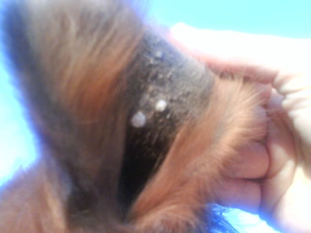 | Dire merci | Hier soir en allant graisser les pieds de mon cheval a la retraite (au pré) j'ai remarqué qu'il avait des petits boutons dans les oreilles. Je ne sais pas depuis combien de temps il a ça car a vrai dire ça fait un petit moment que je ne lui ai pas inspecté les oreilles ... Il en deux dans une et un dans l'autre. Apparement ça ne lui fait pas mal ... Vous pensez a quoi ? Verrues ? [url=https://www.1cheval.com/membre/services/photos/images/60614.jpg] ![]() |