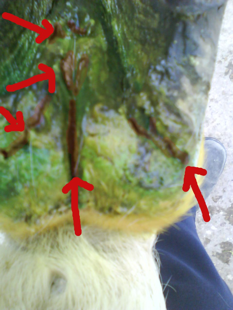 je spoile mais il n'y a pas de vers ! ne vous inquietez pas en rouge, les endroits ou j'en ai retrouvé (ps: le produit vert, c'est l'antiseptique) en jaune, les endroits ou ils avaient cresés des "tranchés" ceci est son autre postérieur( gauche) [url=https://www.1cheval.com/membre/services/photos/images/61504.jpg] ![]() et le droit atteint: [/url] ps dsl pour le format des photos je ne sais pas comment changer |