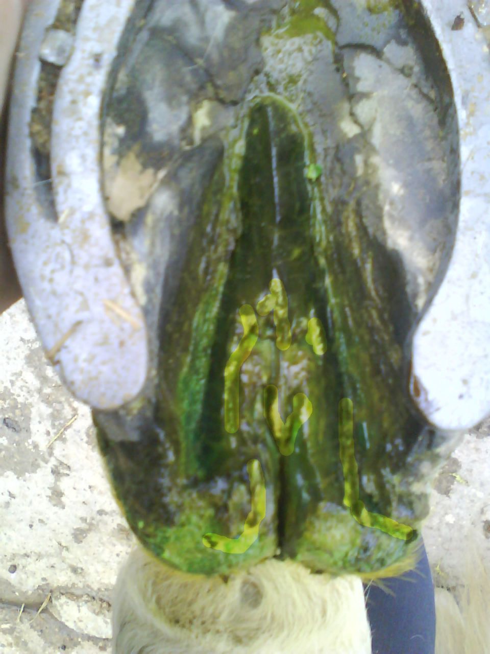 | Dire merci | En complément du traitement du véto, c'est clair qu'il serai bien que le cheval voit le maréchal au plus vite pour nettoyer. |
