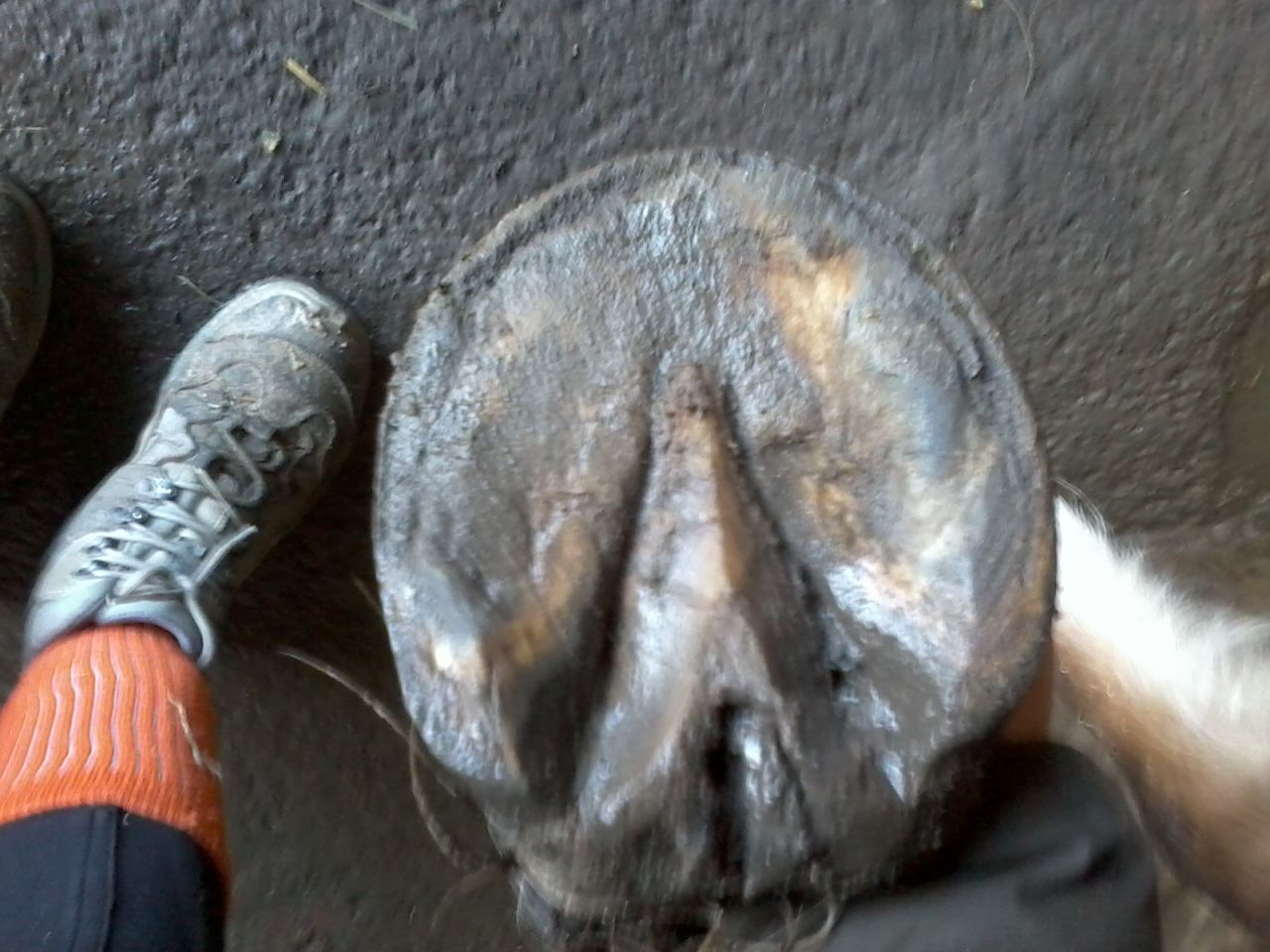 Déconnecté | Cela pète parce que c'est bien trop long, mais ça n'a pas d'importance, cela permet au cheval de ne pas être trop sensible en éloignant la sole des cailloux. Au fur et à mesure tu pourras parer plus court, et en particulier descendre les talons. Au final tu pourrais avoir pratiquement un centimètre de moins de paroi, quand le pied se sera construit pour un fonctionnement pied nu optimal. |