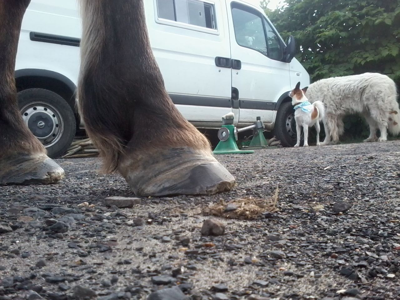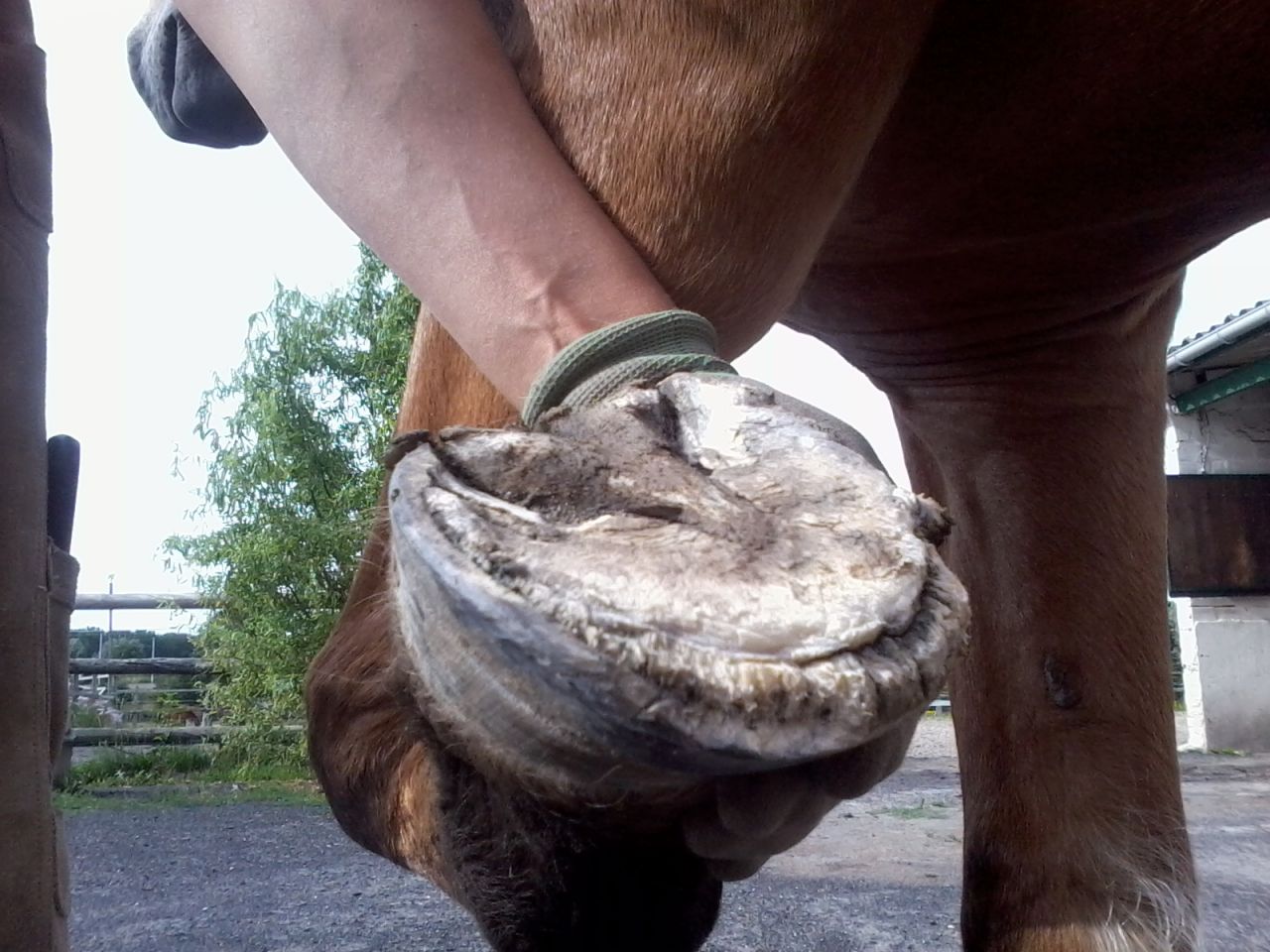 | Dire merci | Hello les jeunes! Quelques questionnements à propos de mon expérience. Comme bcp le savent, ma Kahlia a toujours été pieds nus. Sans vraiment d'entretien, en bossant et dans son pré elle se parait toue seule plutôt régulier, le MF rectifiait à peine qd il passait. Un jour l'ostéo est passé et il m'a fait remarqué qu'il fallait un peu rectifier les aplombs (extérieur sur l'AD et intérieur sur le PD) ce que j'ai fait assez régulièrement depuis ce printemps. De plus la miss étant pleine j'ai cru remarqué (tout en bossant presque pas ces derniers temps) qu'elle faisait plus de corne (hormones? elle a également plus de crin qu'avant). Aujourd'hui, pour la première fois en 7 ans, mon MF a du la parer complètement, couper de la corne en trop et ajuster la paroi. Serait'il possible que le fait d'entretenir plus souvent ça stimule la pousse? Du coup j'ai l'impression qu'elle a de moins bons pieds (enfin quelques petits éclats et fissures en bout de pied, forcément si c'est plus long). Alors soit juste le manque d'usure par le travail... Il faut dire aussi que j'ai pris de l'expérience et que je regarde des choses qu'avant je ne regardais pas forcément. |