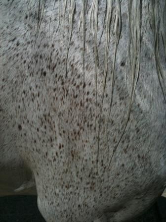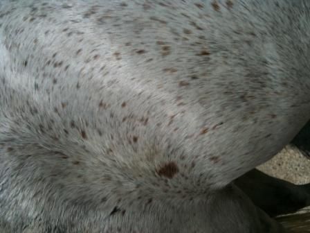 Dire merci | Ils sont pommelés quand ils sont "jeunes" en vieillissant ils éclaircissent et peuvent prendre des truitures ce qui est le cas de la tienne. Elle sera de plus en plus truité comme ça au cours des années. |