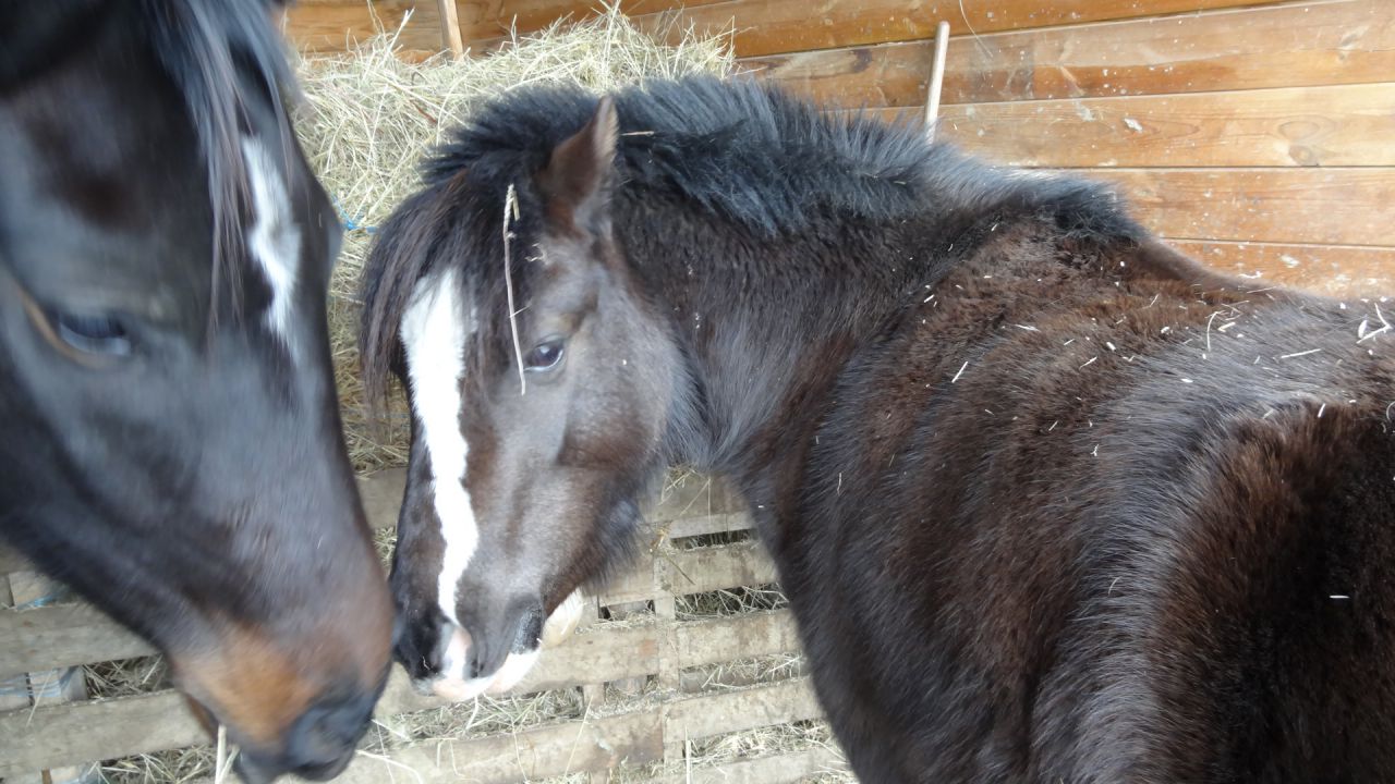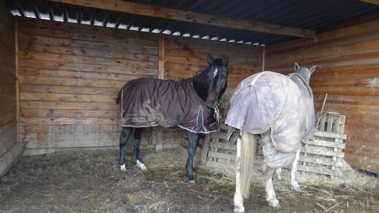 | Dire merci | Elle a une sacré bonne bouille ta puce! J espere que ca va aller mieux pour elle et sa mere! Pourquoi suspectes tu le foin? Sinon, grosse frayeur chez moi aujourd hui.... Mr Abel a decidé d aller faire une virée chez les voisins, accompagné de sa mere et de la ponette ( mon hongre est resté sagement a la maison avec sa biquette de compagnie, y en a au moins deux de serieux!!)... Et chez les voisins, bah y a une piscine! Donc, piscine recouverte de plaques de plexi ( enfin je crois), le tout recouvert de neige et mes trois asticots qui galopent joyeusement autour!!! Je vous dit pas la frayeur que j ai eu!!! Resultat des courses, Abel et sa mere sont gentillement rentré des qu ils m ont vu et la ponette m a fait courrir dans le quartier ( bah oui elle est un peu blonde la memere, elle a trouvé pour sortir mais pas pour rentrer)... Heureusement plus de peur que de mal pour les chevaux mais un peu moins pour la piscine, ils ont peté une plaque.. J ai pas hate d etre a demain quand je vais affronter les voisins meme s ils sont tres sympa.... |