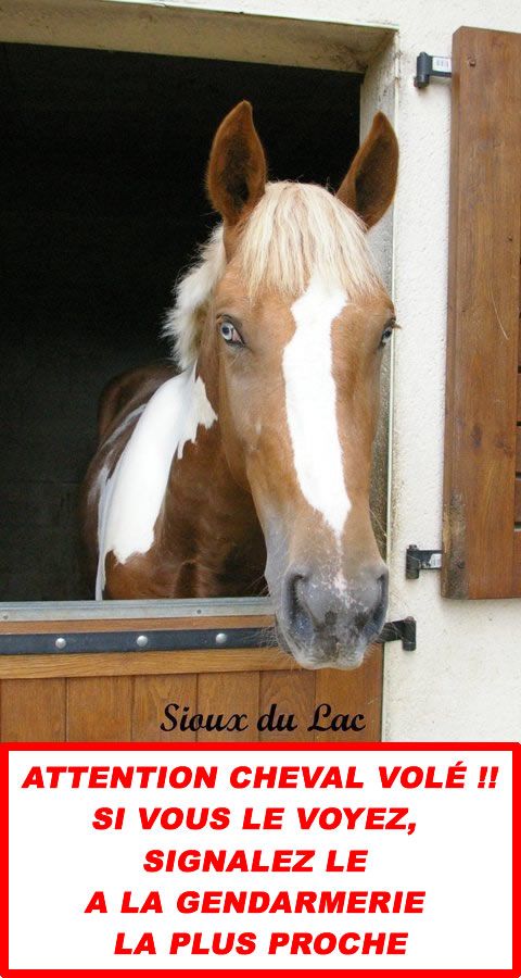 | Dire merci | un marchand ?! Voler un cheval aussi "tape-à-l'oeil" et le revendre, le lendemain, à 550e alors qu'il en vaut, rien que par la robe 1500 de +, et ce, à 20 km du lieu du vol ...je ne crois pas que ce soit un marchand qui a fait le coup ! |
