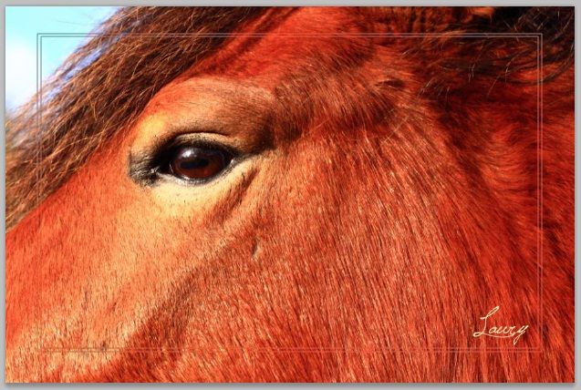 | Dire merci | ![]() ![]() ![]() La mienne, quasi noirs en été et ... nuancé de marron plus clair qui tire vers le rouge en hivers ! La robe aussi est rouge d'ailleurs L'année prochaine je pourrais vous montrer les photos de son poulain qui avec un peu de chance aura les yeux de son papa qui sont d'un bleu ... troublant je dirait ![]() Illustration : ![]() |