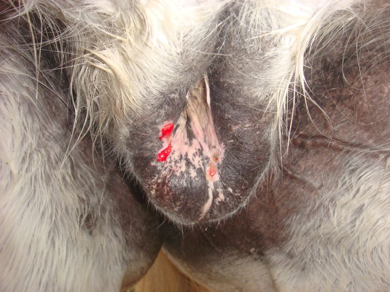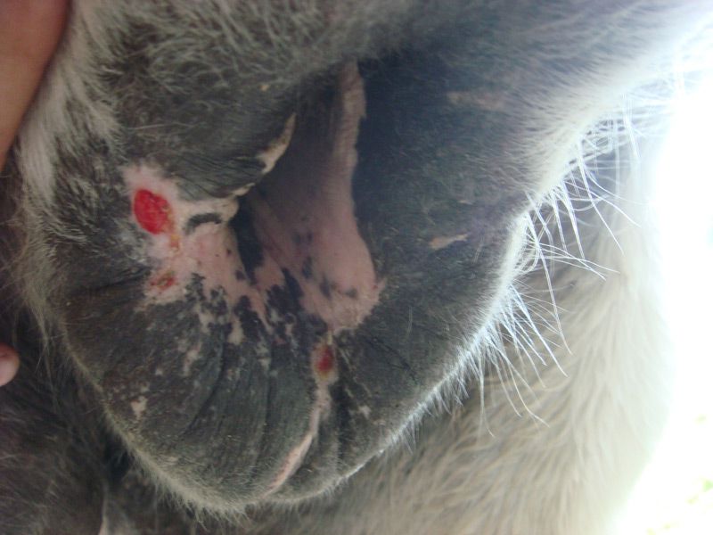 | Dire merci | simplement que la peau rose, est la peau cicatricelle du sarcoide.... normalement il devrait avoir le fourreau entierement gris..... |