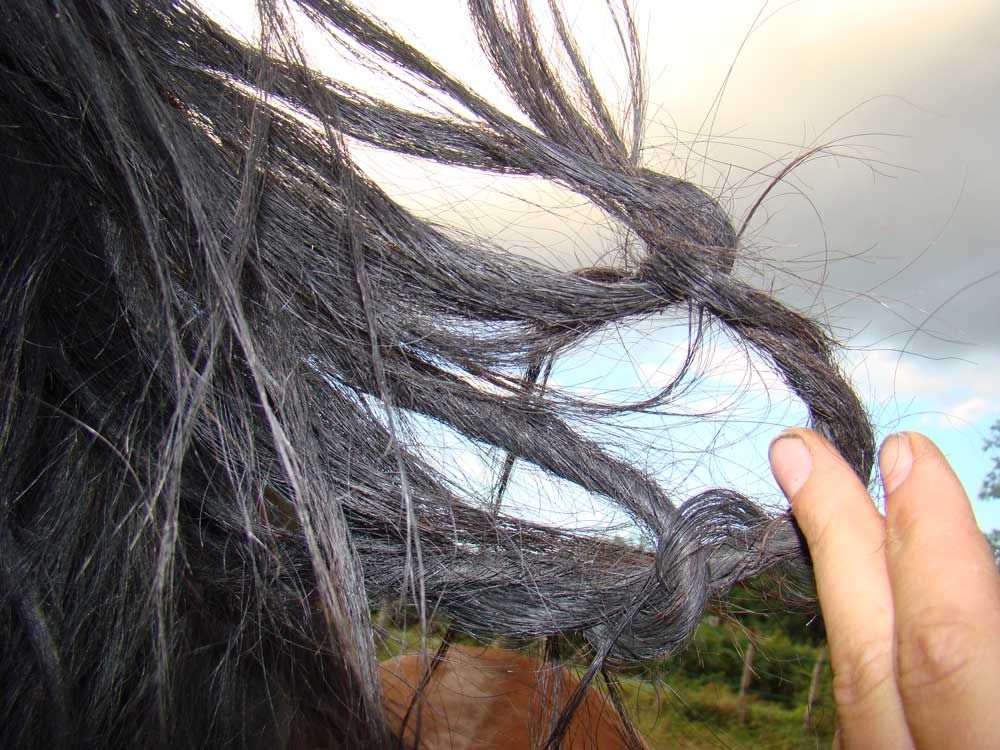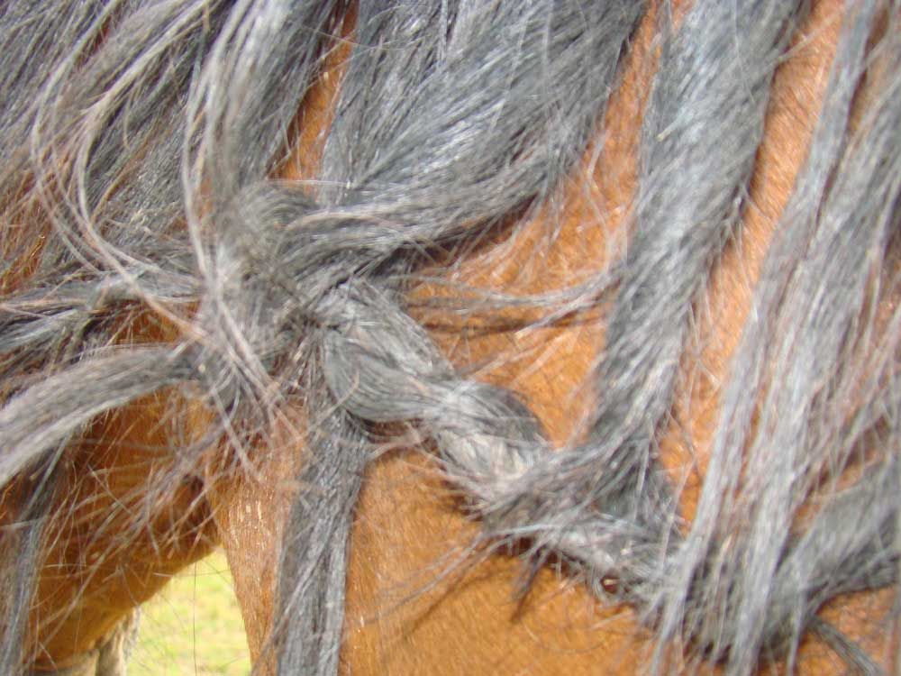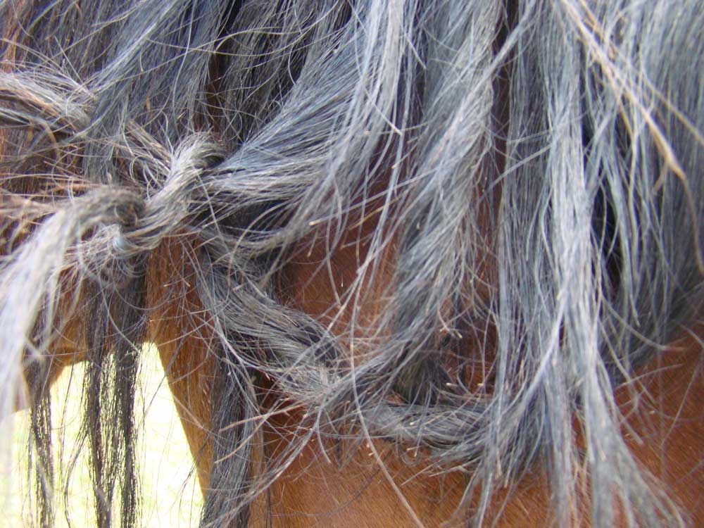 | ma jument est toute "tressée" (elle vient d'arriver, et n'a jamais été brossée de sa vie je pense) , mon cheval ça lui arrive souvent aussi, ils ont les crins épais et ondulés, donc ça fait des genre de dread locks si on ne démêle pas. |