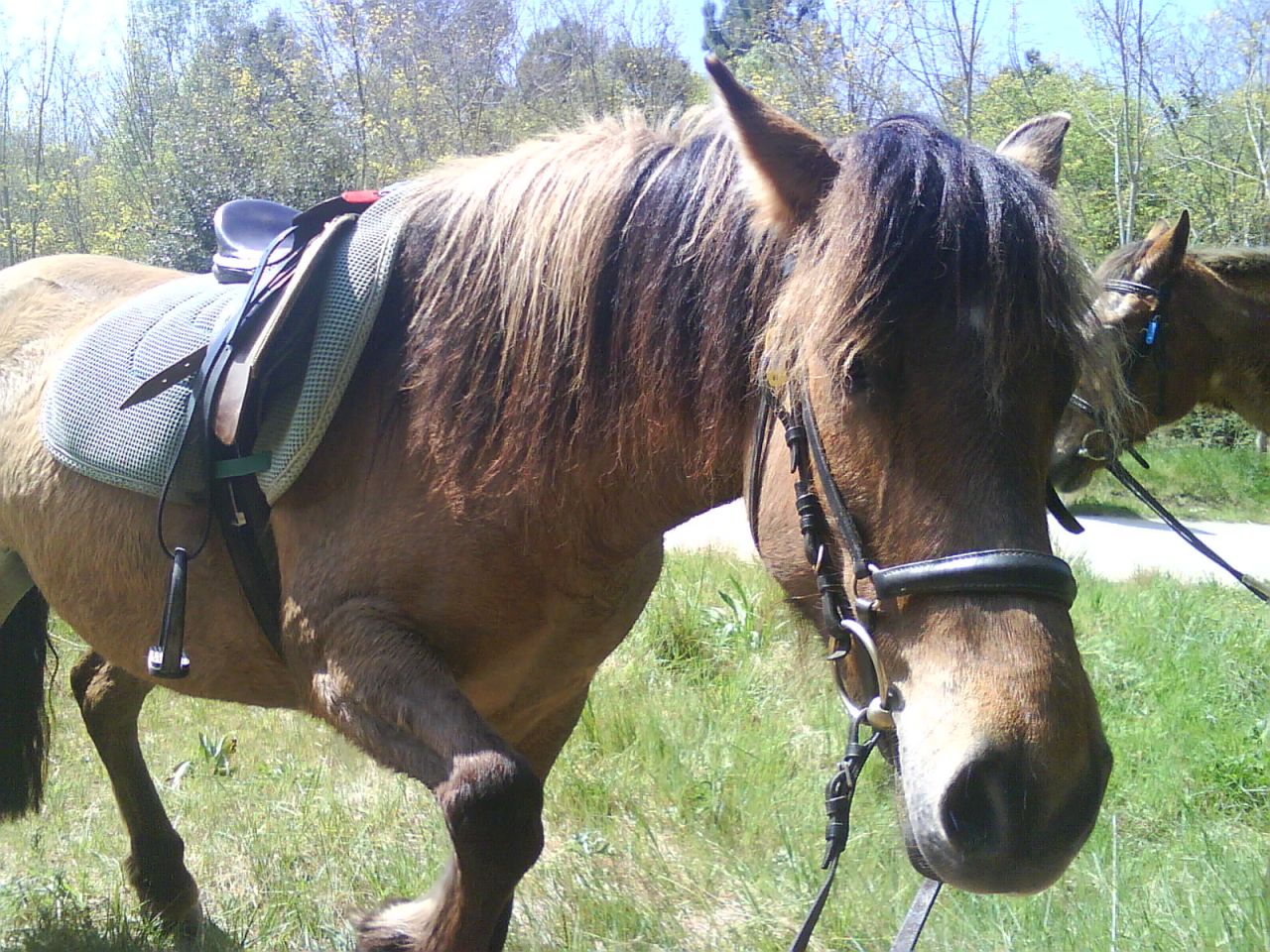 Déconnecté | orkis : en rando je met le licol sous le filet et la longe autour du cou avec un noeud spécial c'est trés pratique et comme ça on attache à un arbre ça va tout seul |