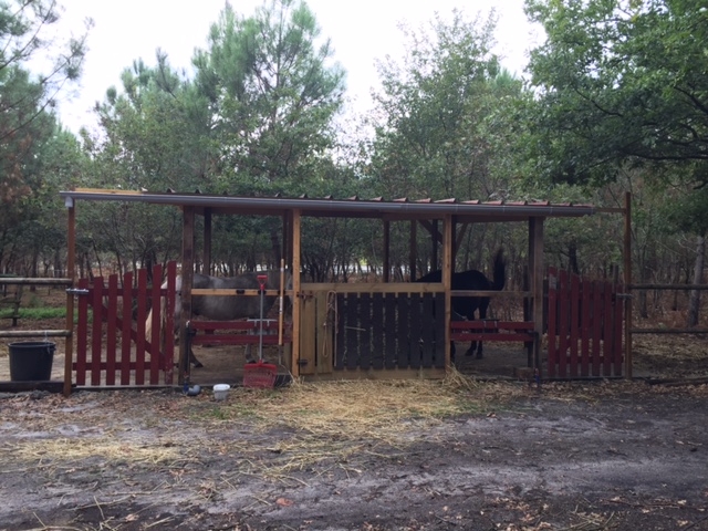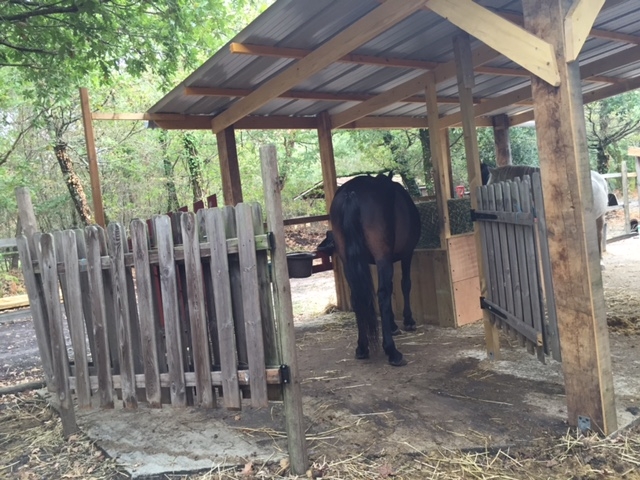 | Dire merci | Le dernier abri en date (plutôt prévu pour éventuellement 3 chevaux). Depuis le chemin, ça donne ça, il y a 2 entrées (si je dois bloquer un des chevaux au box, je peux sortir l'autre), j'ai fait les portes avec un portail acheté 30€ sur LBC. Pour faire la porte qui me permet de rentrer le foin dans le râtelier, c'est encore un portail de LBC pas cher. De chaque côté du râtelier, j'ai laissé 1m50, ça me permet d'accrocher les seaux pour leur donner à manger sans rentrer dans le paddock, d'installer les abreuvoirs automatiques et les blocs de sel (un de chaque côté). ![]() Depuis l'intérieur, ça donne ça, je fais toujours 2 ouvertures, de façon à ce qu'ils ne se coincent pas, là pour faire les portes du "box", j'ai utilisé des barrières de potager, c'est assez léger et ça fait 1,80m de long, c'est idéal (et pas cher). ![]() La vue de l'autre côté: Le "mur" central qui permet de rabattre les deux portes peut être monté jusqu'au toit, je ne l'ai pas fait, mes chevaux préfèrent les boxes plus ouverts (j'avais fait des murs plus hauts sur un autre abri, mais ils y vont moins). ![]() Pour les tôles, compare les prix, ça va du simple au triple! J'ai trouvé celles-là sur LBC en neuf à 5€ la tôle. Le plus cher reste le béton, je fais de grandes dalles pour ne pas être embêtée, en fibré (ça évite de ferrailler) et livré en camion toupie. En faisant son béton soi-même et en ferraillant, on gagne pas mal, mais c'est beaucoup plus long et pénible. Voilà voilà, y'a plus qu'à Et alors, la nouvelle que vous avez visitée, ça donne quoi? |