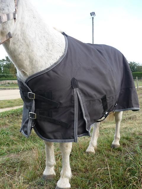 Dire merci | Pareil, elle est juste un peu longue, car ta ponette est petite. Mais sinon, ça lui couvre bien le popotin ! Si tu resserres un peu à l'avant, ça lui remontera un peu sur l'encolure. |