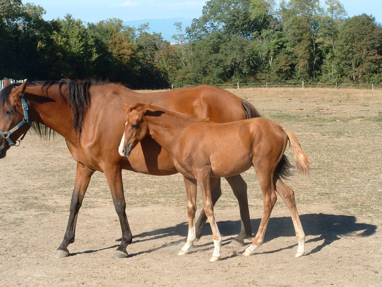 | Dire merci | ah et une autre: pouliche OC par étalon DSA pie alezan et mère OI très typée ibérique pour le moment pas manipulée, mais le sera au sevrage (longe, pied, soins...). Fera environ 1M55 (selon véto, parents dans cette taille) la photo la met pas en valeur... beau modèle, 4 balzannes. Pour sa couleur elle sera alezan brulée. Bons aplombs. A noter: suite a une blessure a 1 oeil elle aura toujours une gène à la vision de l'oeil droit vers l'arrière, mais cela ne l'empêche pas de voir correctement ![]() |
