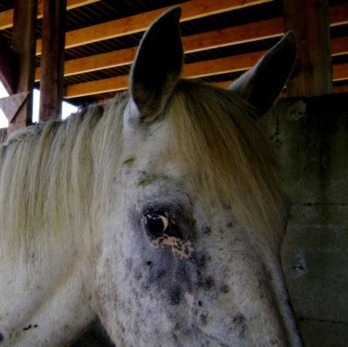 | Dire merci | Alors tous les appaloosas ont un problème digestif: c'est une critère de la race que d'avoir le blanc de l'oeil apparent. Sur mes 4 chevaux, j'ai 3 yeux avec le blanc de l'oeil apparent: Tessa a les 2 et Dunia en a 1. Avant on disait aussi que c'était les chevaux fous qui avaient cela. j'ai donc un demi cheval fou et avec des demis problèmes digestifs. Pas de photos récentes sous la main |
