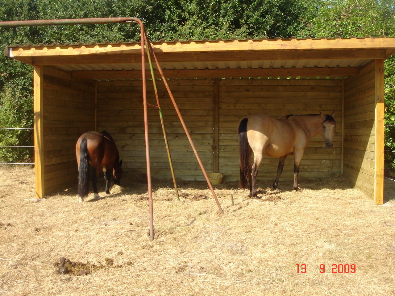 | Dire merci | Voila mes chevaux rentrent à la maison ce week end. Sur un terrain de 12 ares (en quittant les 1.5h d'été ou il n'y a aucun abri, ni arbre pour se protéger des intempéries ou du vent, et ou ils retourneront au printemps), petit terrain ou il y a un box, au bas du terrain qui est en pente. Cependant, nous aimerions faire deux "box" ouverts de 3*3 chacun plus près de la maison, donc un abri de 6*3. Pour que chacun puisse se reposer et y manger en paix. Et pas qu'un seul n'ait qu'une moitié de ration et l'autre se goinfre. Je fermerai je pense la nuit avec une chainette sur chaque entrée. Seulement j'aimerais avoir une idée du budget. Donc pour construire vos abris, quel est le cout de revient ? De plus est il mieux de laisser le sol en terre battue ou bien de le recouvrir de quelque chose? J'avais pensé à mettre de la paille pour que ce soit "douillet"..... Merci |