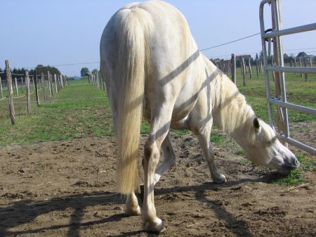 | Dire merci | la tresse d'étalon tient très bien et a l'avantage de se refaire en moins de deux entre les deux boucles si besoin est. Il ne faut juste pas trop la serrer parce qu'au moindre mouvement d'encolure ça déforme tout. Filou, avec ton diplôme tu peux te reconvertir en coiffeur de chevaux ! Gala s'est pas loupée, mais juste sous le toupet....elle a bien visé pour que ça ne se voit pas de trop ! ![]() Elle vendrai son âme au diable pour un peu plus d'herbe !! |