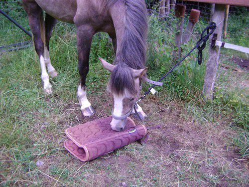 | Dire merci | colomba : effectivement il est en grand manque de parage... je remettrais des photos une fois paré, mais ça va pas revenir en une seule fois Iris : je commence tout doucement , il marche et s'arrete en longe et aujourd'hui j'ai commencé à le faire trotter. Pour le tapis et le surfaix ben il a rien dit el bimbo : cte bouille de poulinou il est un peu + large en tete que Djitho mais il lui ressemble quand meme |