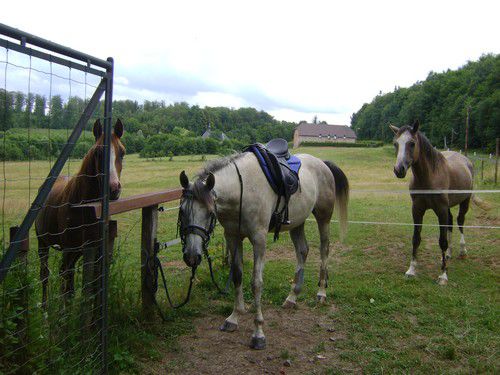 | Dire merci | on a sortis les nôtres au pas cet aprem vu que bon ils sont encore au box et que ça fait deux jours qu on marche à coté. Mission" faites ce que vous voulez ,les gars mais marchez un peu en broutant." ils etaient à 0,5 de tens .. je disais à filou en me marrant betement en faisant yaouyaou à un malik inerte qu'on pouvait se brosser pour un depart au galop aux aides.. C''est marrant comme ils sentent qu'on va pas (et qu'on veutpas)bosser du tout |