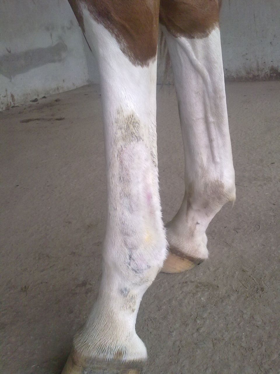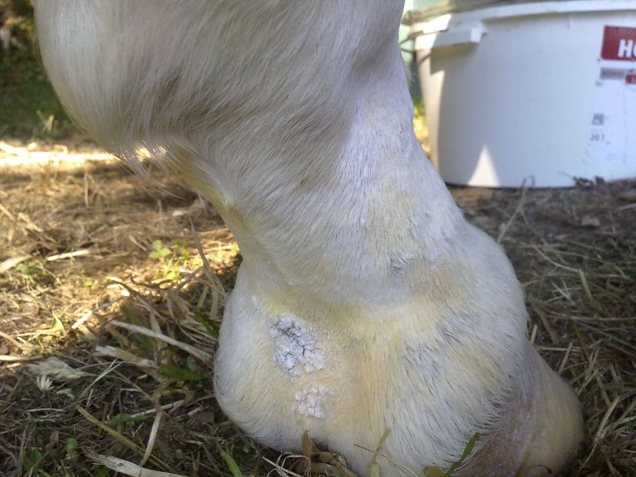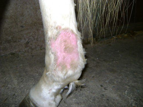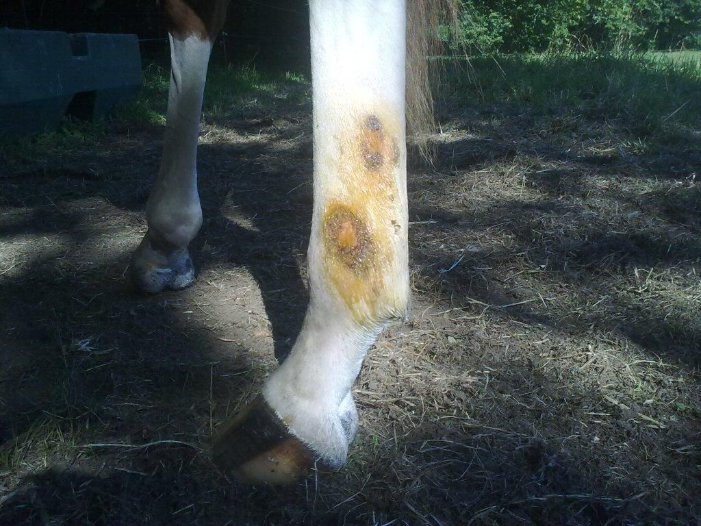 | Dire merci | A l'élevage pas loin, quand ils ont ça on mettait un mélange de sulfate de cuivre et de vaseline, un peu hard core, mais très vite on obtenait la peau rose et propre Le truc c'est que ça brûle sur une plaie comme ça, donc je vous imagine les jeunes qui nous voyaient arriver avec notre mixture et notre pinceau...et les coup de pieds auxquels on échappait... Ce n'est nullement issue de l’hypothétique sadisme de l'éleveur, c'est un véto qui lui a donné ce remède Mais le souci c'est que vue la douleur provoquée, faut travailler à côté pour garder la confiance du lardon et pouvoir continuer à prendre les pieds ! Un fois sur l'un d'eux ça s'est infecté, là c'était antibio, lavage avec un savon antiseptique qui a déjà été cité plus une crème genre fushidine On s'est aperçu que ça touchait surtout les alezans à chaussette, plus que les gris et les baies (chaussettes ou pas) |