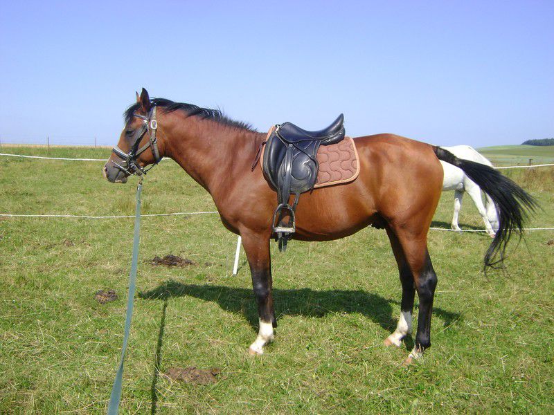 | Dire merci | je le trouve joli mais un peu sur les épaules (il grandit peut être) et sortie d'encolure vachement basse, encolure trop forte et un peu droit sur ses jarrets. |
