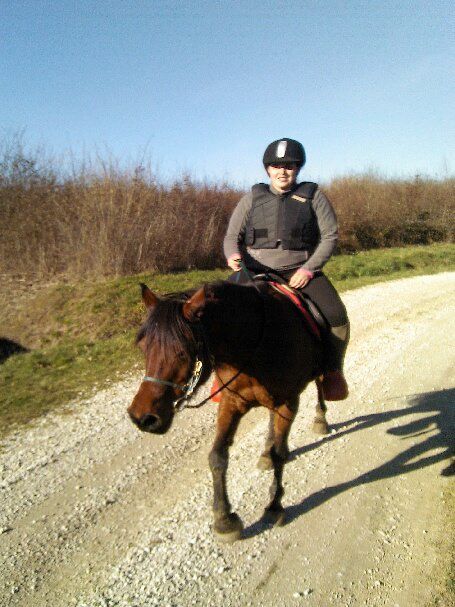 | Dire merci | c'est une crème cette pouliche. Mais elle peut être très têtue, et je sens clairement qu'elle n'a jamais rien vu d'autre que son parc en alsace. Mais comme elle est sympa elle prend tout bien pour l'instant. J'ai fais la sortie à pied puis je suis monté dessus sur le chemin devant le parc pour travailler un peu la direction, l'arret et la marche avant. On avance doucement mais surement, en attendant que j'ai quelqu'un qui m'accompagne à cheval avec. |