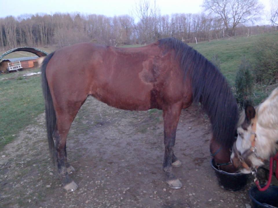 | Dire merci | Pour ta selle, Colomba, je suis un d'accord avec Oc, tu va commencer à le monter alors qu'il ne sera pas fini, donc même si tu revends celle-ci tu prends le risque que la nouvelle ne convienne pas au final. Celle de Yacoub ne pourra pas lui convenir dans un premier temps? Sinon, Wellan a vu l'ostéo hier, il avait plein de chose bloquées, il pense plus à une chute qu'à une compensation. Bref, nouvelle ferrure + crevasse = blocages divers, c'était pas top. L'ostéo à tout remis et me dit que l'idéal serait de le mettre au box deux jours avec marche en main, mais qu'étant donné que Wellan vit dehors à l'année, il risque de péter un câble, non? euh...non, non, il l'aime bien son box |