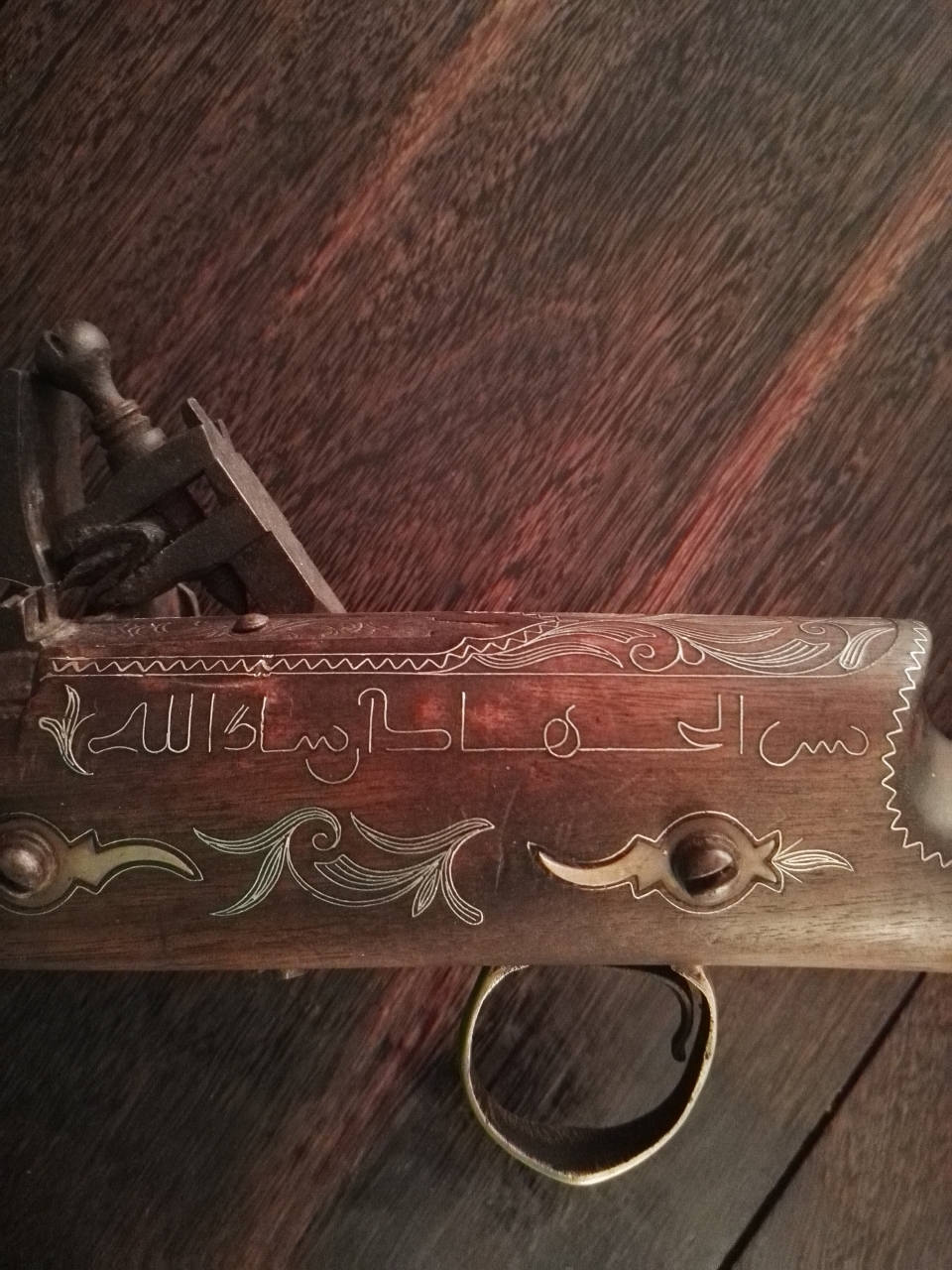 | Dire merci | Bonjour, En plein déménagement, j'ai retrouvé le fusil de fantasia (moukhala) de mon grand père qui vivait au Maroc. J'ai entrepris de lui faire un petit toilettage et quelle n'a pas été ma surprise de voir qu'il était décoré (fils d'argent incrustés) et qu'il y avait deux inscriptions en arabe. C'est là que j'aurais besoin de vos "lumières".... Que veulent dire ces inscriptions? Ca pourrait être de l'arabe ancien (ou du kurde?) La plus longue pourrait vouloir dire "on fera le jihad si Dieu le veut" mais la deuxième reste une énigme complète. Voici des photos avec les inscriptions et leurs emplacements au cas où ce serait utile. ![]() ![]() ![]() ![]() Merci d'avance pour vos retours. |
