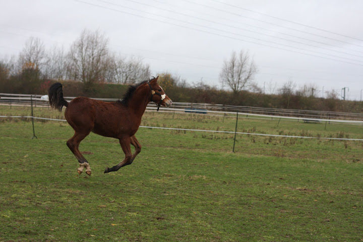 DéconnectéDire merci | Mon poulain shagya est arrivé hier : à part une tête délicate avec de grands yeux écartés dans un front large et des oreilles recourbées, il n'a rien d'un arabe, il est hyper costaud ! Par contre, dès qu'il bouge, on voit un peu mieux le courant de sang ![]() |