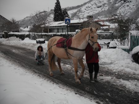DéconnectéDire merci | Aujourd'hui j'ai mis Max le poney à la luge. Il a déjà fait connaissance (suivre, puis marcher à côté, puis être suivi, par la luge que je tenais, l'an dernier (il avait 2 ans et demi) Là j'ai recommencé l'opération, il n'avait rien oublié (il a eu un rappel cet été, avec la remorque du tracteur à pédales )A la fin j'ai attaché la luge aux traits... Et roule brave petit ! Demain faut que je passe de la tête aux longues-rênes et travaille la traction, aussi. une luge toute seule, c'est léger ! Avec qqn dessus c'est moins drôle. Heureusement le jeune est baraqué comme un cheval de trait miniature ! |