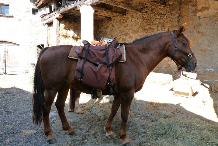DéconnectéDire merci | Danée tout dépend de ce que tu veux faire. Dans les pyrénées on voit des ânes porter du foin avec juste un drap noué aux 4 coins, plein de foin et attaché à l'âne par une sangle. Les sacs de jute on peut aussi les placer sur un tapis western mais faut pas se leurrer, on ne porte pas 50 kilos de matériel dans des sacs non arrimés. Pour le portage ( c a d plus lourd qu'un pique-nique) il faut un arçon en bois (bât) correctement posé sur le dos (avec un tapis épais, une sangle, une avaloire, bricole) sinon outre le fait que les affaires ne tiennent pas sur le dos, tournent, se renversent... L'âne se blesse... C'est pourquoi les randonneurs humains ne partent pas avec leur barda dans un sac à pommes de terre jeté sur l'épaule, mais avec des sacs à dos à armature, aux bretelles rembourrées. Par contre pour une bouteille d'eau et un sandwich, une banane à la ceinture suffit... Pour acheter du matériel tu peux aller chez Cab'ane ou chez Lacuche ou encore chez âne-agile. là Lotus porte 2 petites bt d'eau, un paquet de biscuits et un Kway, le tout attaché à un surfaix sur un tapis assez mince [img]http://ardenne-informatique.com/~ardennesacheval/lotus/balades/rando2009/orig/p1010033.jpg" alt="" /> là il portait dans les 40 kilos je crois, sur un bat, avec les sangles adéquates : ![]() |