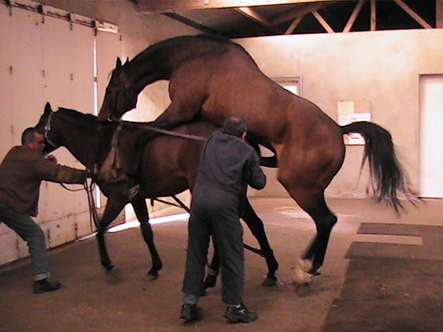 | Dire merci | allez je met les photos, rien que pour embeter (enfin ca permet de lever les tabous que de montrer comment ca se passe, avec les explications):![]() ![]() Donc la jument qui, en temps normal (pas en chaleur) est une sacrée pétasse n'a pas bronché pour la saillie, mais elle avancait à cause du poids, alors aux HN tout le monde met la main à la patte pour aider et que ca se passe vite. |