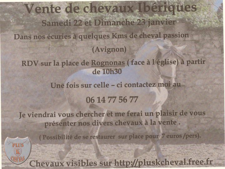 | Dire merci | joli effectivement! mais c'est un marchand qui importe des chevaux pas un éleveur? c'est dommage, je ne vais pas à avignon, mais je serai dans ces coins là (camargue) le week end du 25/26 février... c'est pas que je cherche vraiment, mais j'ai un PRE et j'avoue que j'ai vraiment un faible pour cette race.. |
