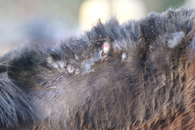 | Dire merci | Bonjour, Depuis presque un an, mon cheval a des abcès récidivants au niveau de l'encolure. Au début (mars 2010) ça a commencé comme un abcès tout ce qu'il y a de plus classique (une boule dure et douloureuse). Puis d'autres boules sont apparues par la suite. Au mois de juin, je l'ai fait emmener en clinique vétérinaire, là il a été opéré sous anesthésie générale pour réaliser un débridement (ils ont trouvé des microabcès à l'intérieur). La biopsie a conclu à une panniculite granulomateuse et nécrosante multifocale sévère. J'ai récupéré mon cheval avec pour instructions de nettoyer les plaies avec une compresse imbibée d'eau. Quand ça s'est remis à suppurer, j'ai donné un traitement homéopathique qui a bien fonctionné. Depuis début décembre, des boules se sont à nouveau formées et mises à suppurer. J'ai donné un traitement à base de PVB abcès et d'EM. Personne ne sait vraiment quelles sont les causes des ces abcès, il n'est donc pas possible de proposer un traitement qui permettra de guérir mon cheval. C'est pourquoi je recherche des personnes qui ont un cheval qui a le même genre de pathologie ou bien qui en connaissent un. Tous les témoignages sont les bienvenus. Je mets ci-dessous une photo : |