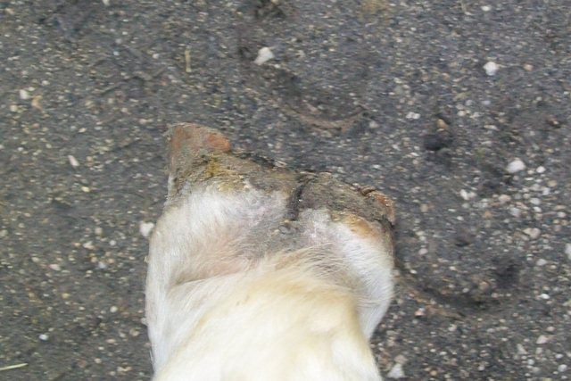 DéconnectéDire merci | Ce n'est pas le noir qui me fait dire qu'il y a pourriture profonde de la lacune centrale (qui ne ressemble pas à la pourriture classique de surface) sur les deux pieds, mais la fente entre les glomes, qui remonte dans les poils. Je parie que tu peux rentrer la pointe du cure-pied bien profond dans ces fentes... Je n'ai même pas à parier d'ailleurs, tellement c'est évident comme le nez au milieu de la figure. |